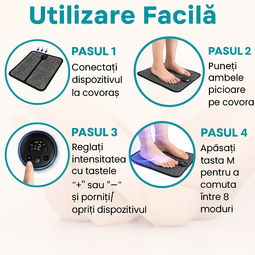 Nu este doar un masaj, ci o resetare a confortului zilnic. Stimularea EMS acționează profund asupra zonelor tensionate, ajutând picioarele să-și recapete ușurința, iar tu să te simți mai relaxat, mai echilibrat, zi după zi. Rezultatele pot varia de la o persoană la alta.
